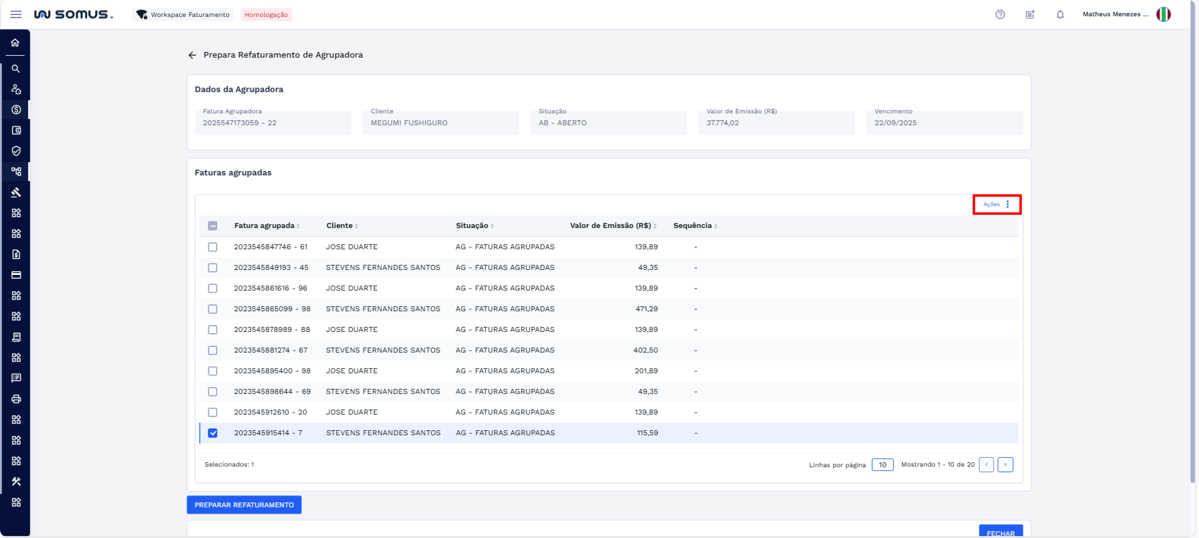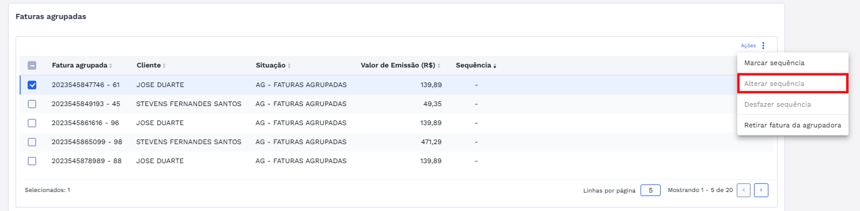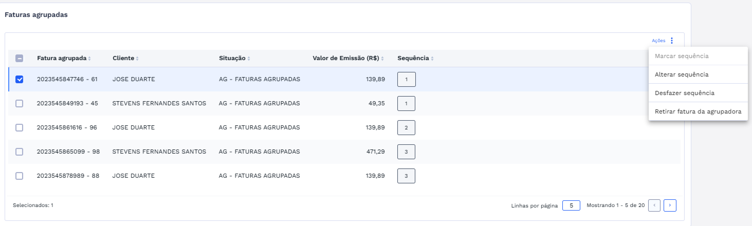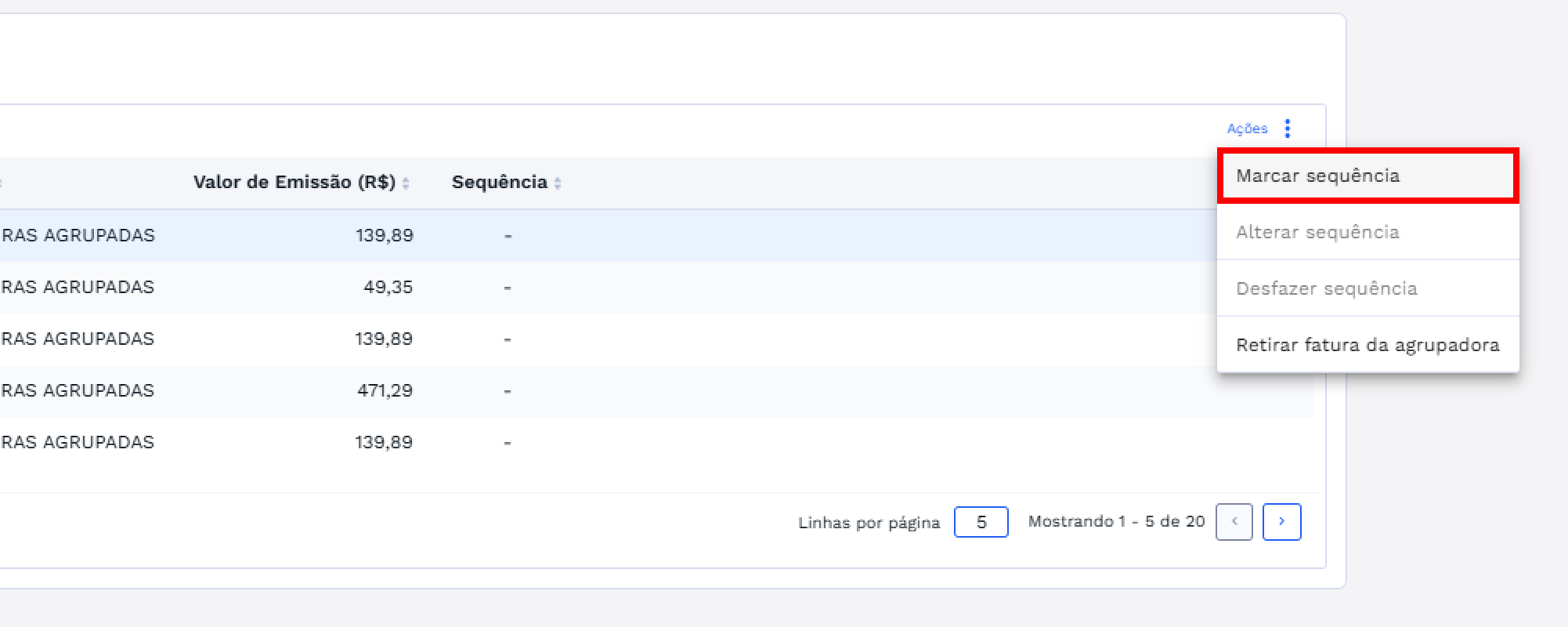Para marcar a sequência de uma fatura agrupada, selecione um ou mais itens na lista. O botão “Ações” será habilitado, conforme imagem abaixo: