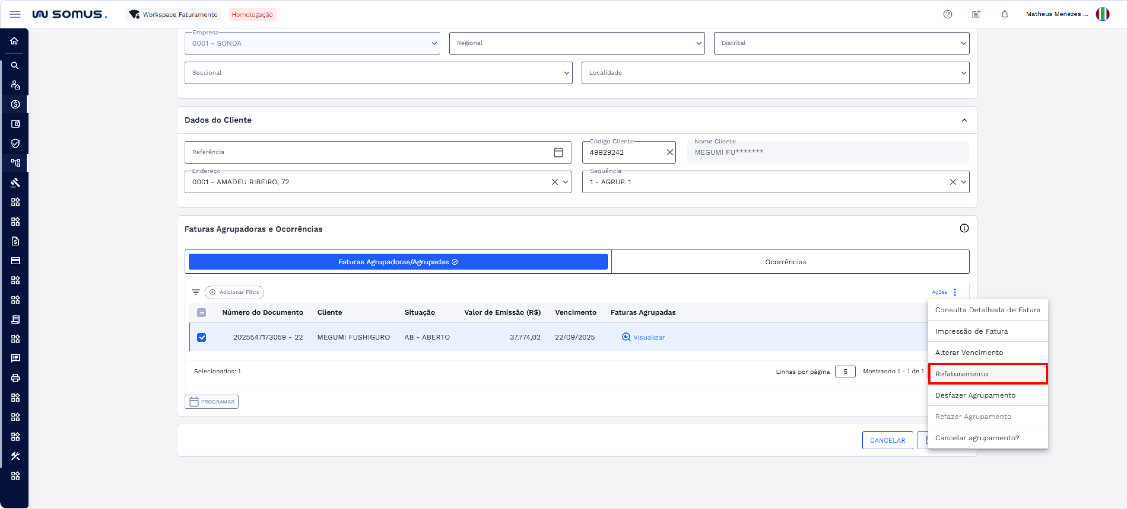 Para acessar a tela Prepara Refaturamento de Agrupadora, é necessário selecionar o documento desejado na lista de faturas agrupadoras/agrupadas, o que habilitará o botão “Ações”. Em seguida, clique em “Ações” e escolha a opção “Refaturamento”.