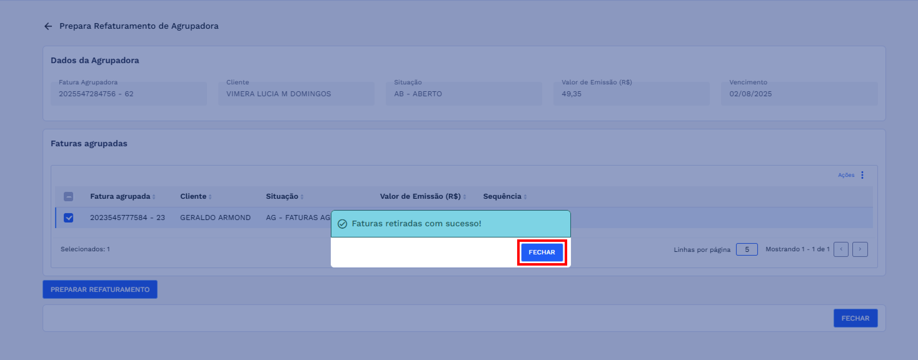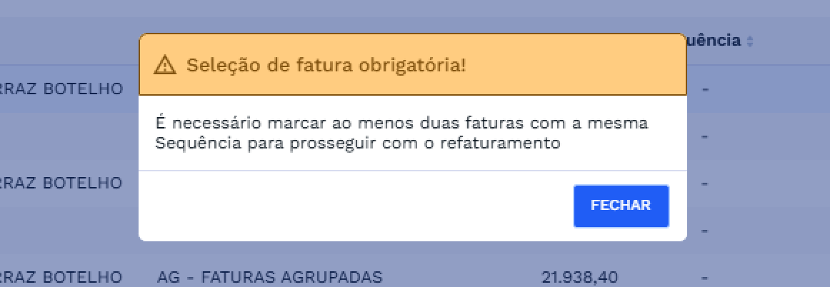 O usuário deve clicar em “FECHAR” para retornar à lista e ajustar a seleção, garantindo que pelo menos duas faturas com a mesma sequência estejam marcadas. Essa validação garante que o refaturamento seja aplicado somente quando houver faturas suficientes selecionadas.