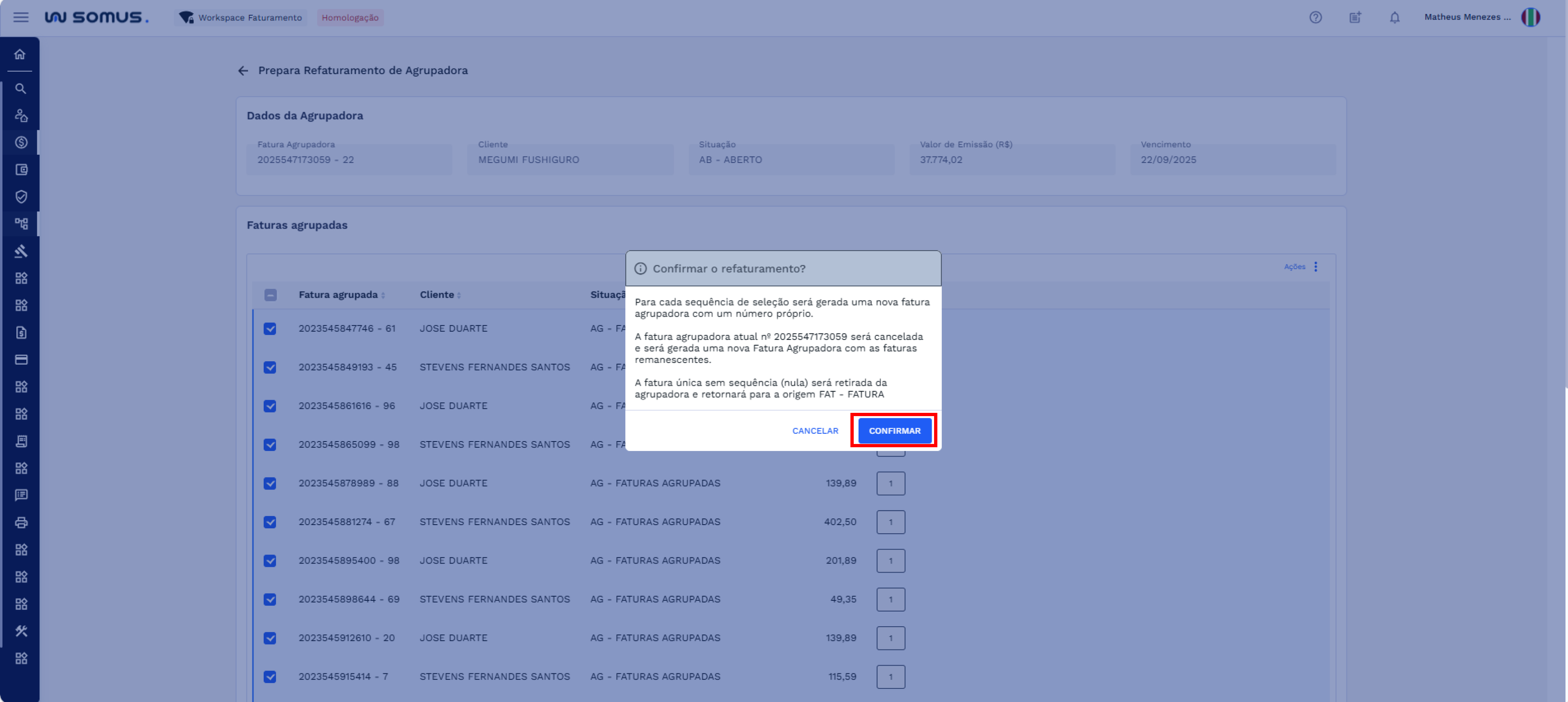 Para prosseguir, clique em “CONFIRMAR” para que o sistema realize o refaturamento conforme o cenário aplicável. Caso não deseje efetuar o refaturamento, clique em “CANCELAR” para fechar a caixa de diálogo sem alterar as faturas. Após clicar em "CONFIRMAR”, o sistema concluirá o processo de refaturamento.