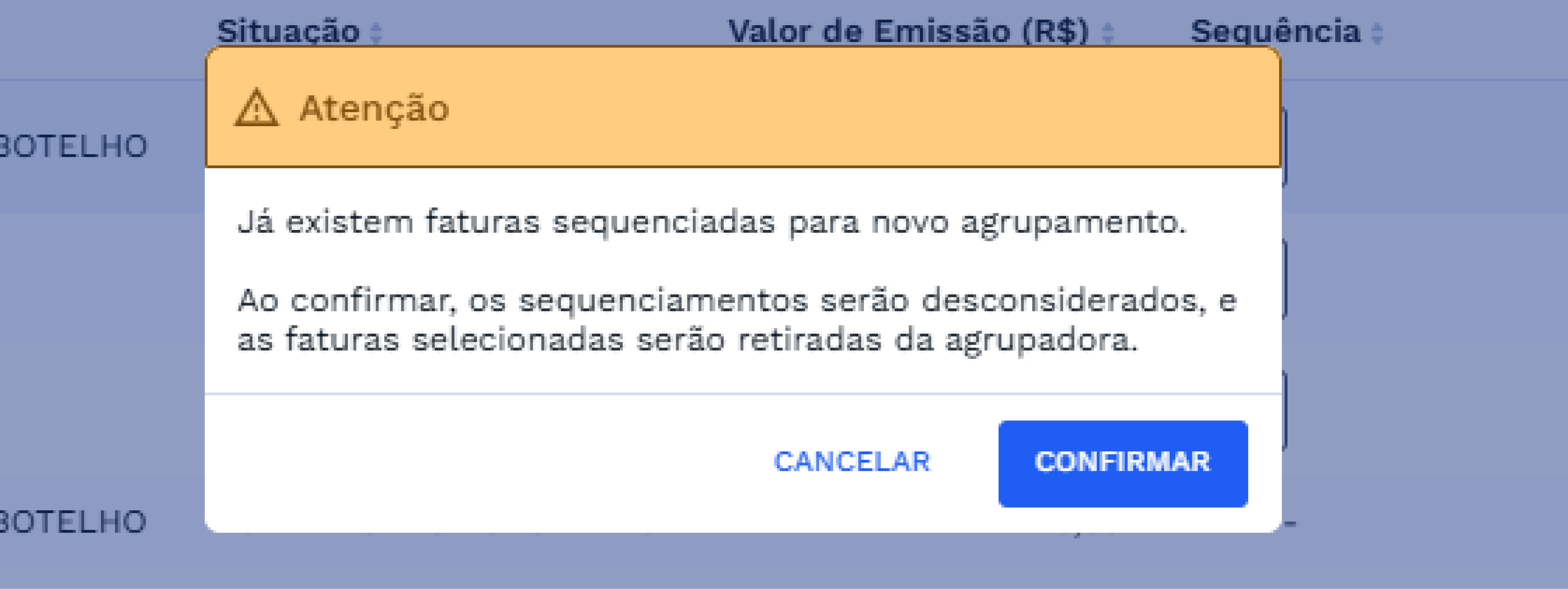 Caso o sistema identifique faturas sequenciadas para novo agrupamento, os sequenciamentos serão desconsiderados e as faturas selecionadas serão retiradas da agrupadora.