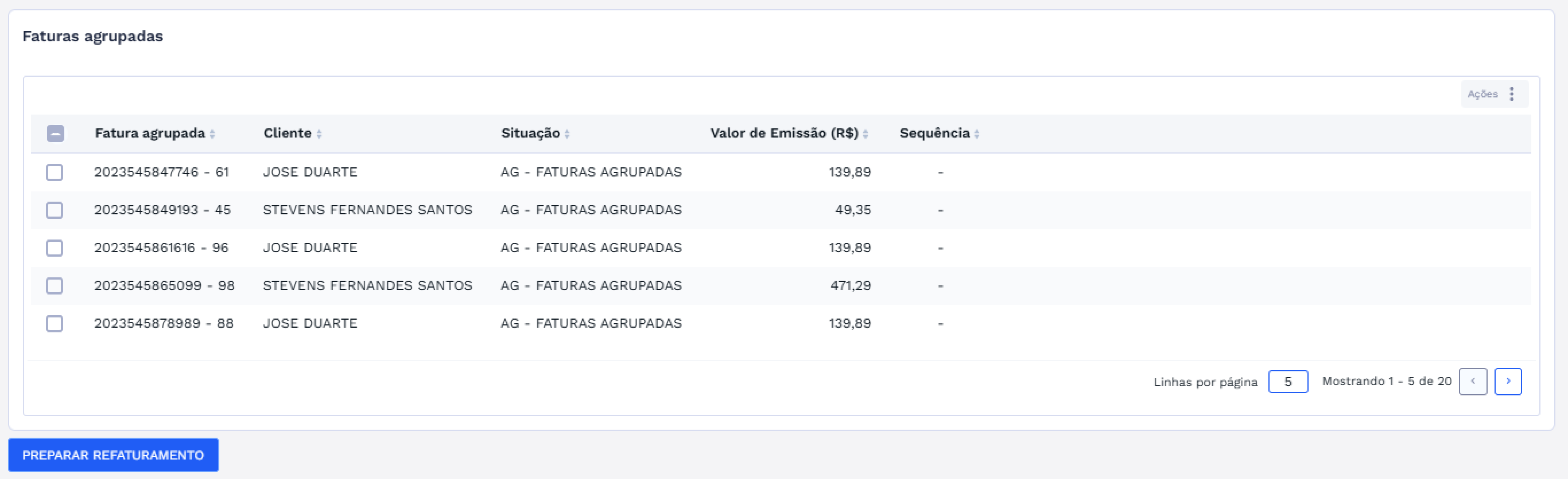 Lista todas as faturas agrupadas vinculadas ao documento agrupador, mostrando número da fatura agrupada, cliente relacionado a cada fatura, situação, valor individual e, quando aplicável, a sequência marcada para retirada ou reagrupamento. Ainda na tela principal, é exibido o botão “PREPARAR REFATURAMENTO”, cujo funcionamento pode ser consultado na sessão de PREPARAR REFATURAMENTO.